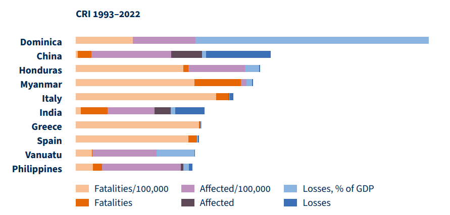 The Climate Risk Index (CRI) Ranks countries by the human and economic effects of extreme weather events. The most affected country is ranked first and the least affected country will have the lowest rank. Dominica, China, Honduras, Myanmar, Italy, and India were the most affected countries from 1993 to 2022. For the year 2022 CRI top 10 countries were Pakistan, Belize, Italy, Greece, Spain, Puerto Rico, USA, Nigeria, Portugal and Bulgaria.