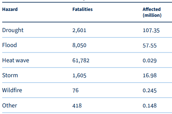 In the year 2022, Heat Waves caused most of the fatalities at the global level while drought affected most people. The table below provides the fatalities and the affected people in the year 2022.